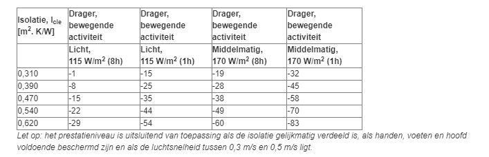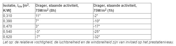 Isolatie, Icle [m2. K/W] Drager, staande activiteit, 75W/m2 (8h) Drager, staande activiteit, 75W/m2 (1h)