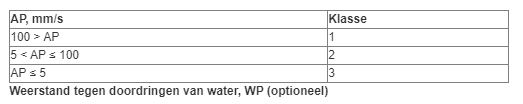 - Y = klasse m.b.t. weerstand tegen doordringen van water (1-2, waarbij 2 het best is); optioneel.